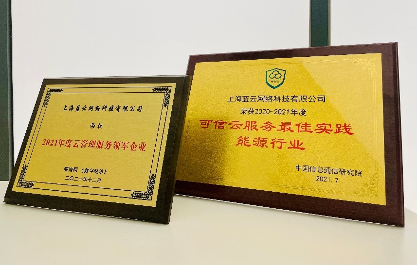 - 整合一站式MSP云管理服务,为我国能源巨头之一,提供从云到端全方位运营运维服务,帮助业务可用性、连续性提升了90%,并荣获由中国信息通信研究院颁发的“2020-2021可信云服务最佳实践能源行业”奖项。蓝云也凭借卓越的云管理服务能力,在“2021首届数字经济领航者峰会”上荣获“2021年度云管理服务领军企业”大奖。