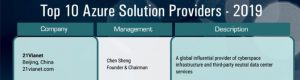 近日,APAC CIO Outlook正式发布了“Top 10 Azure Solution Providers-2019”榜单,世纪互联从来自APAC(亚太地区)众多Azure解决方案提供商中脱颖而出,成功入选。